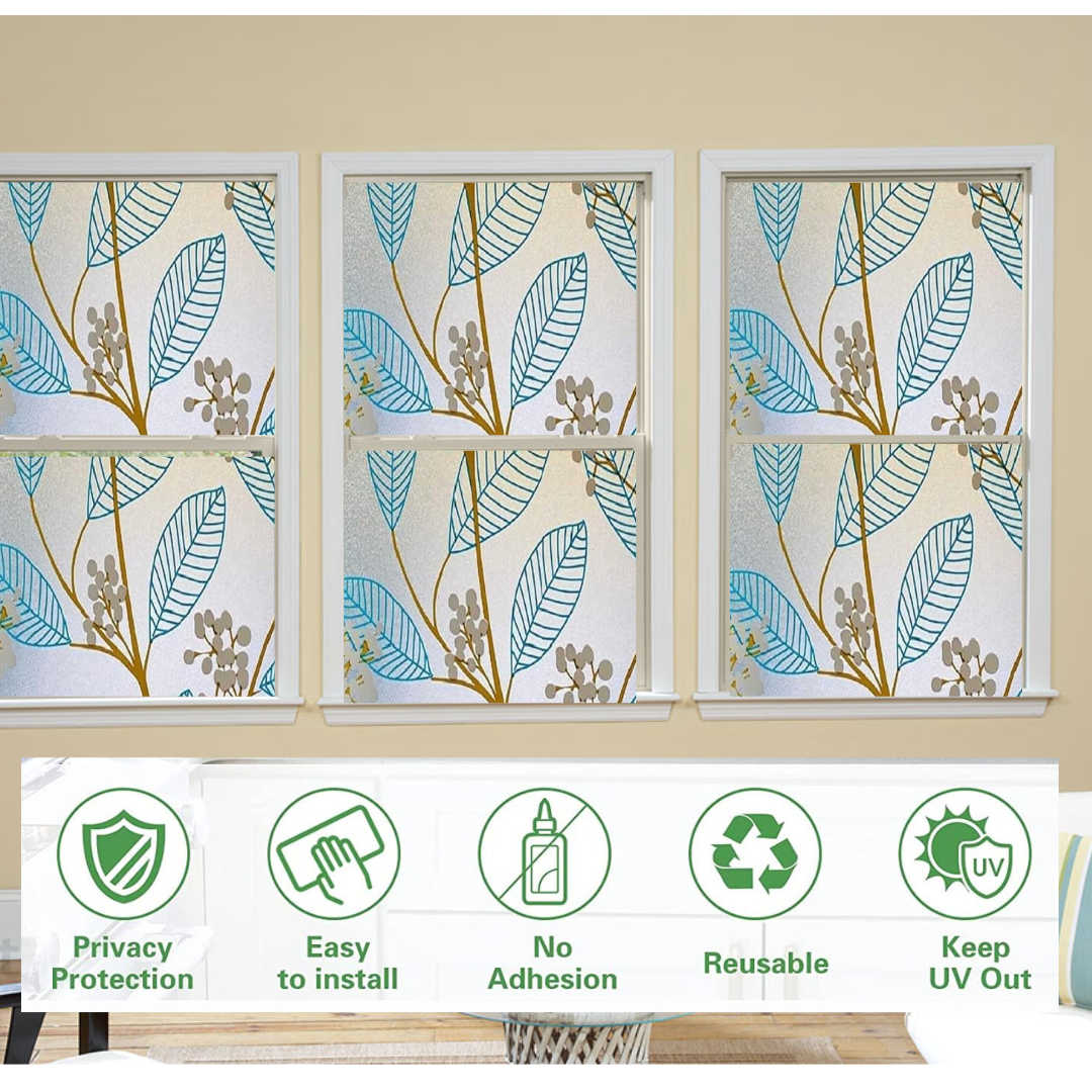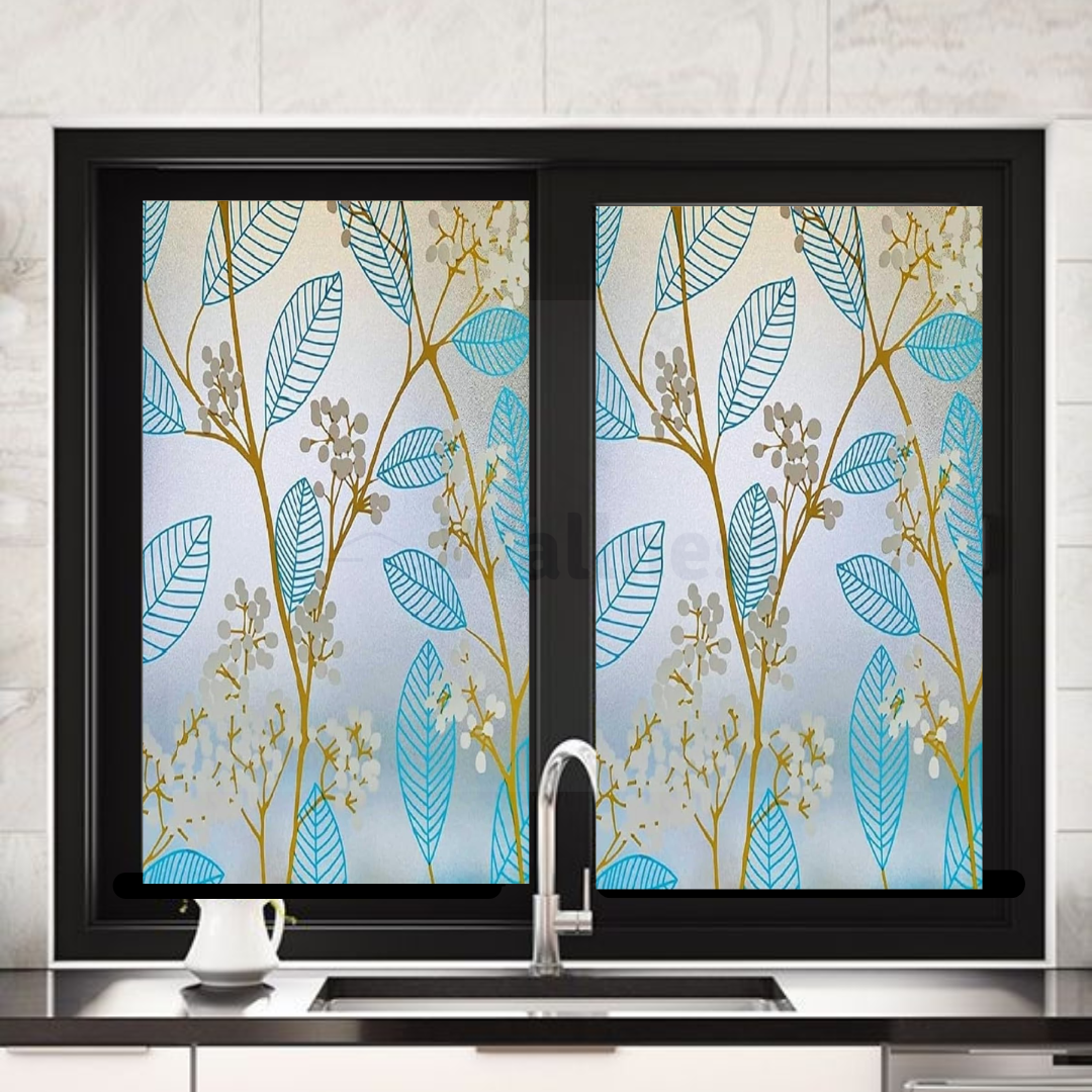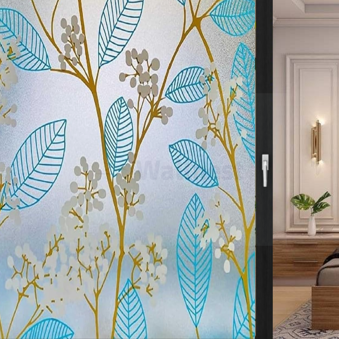 Wallnest Blue Leaves Privacy Window Film – Frosted Glass Vinyl, Self Adhesive Decorative Window Sticker for Home, Office, Bathroom, Kitchen – Removable, Waterproof