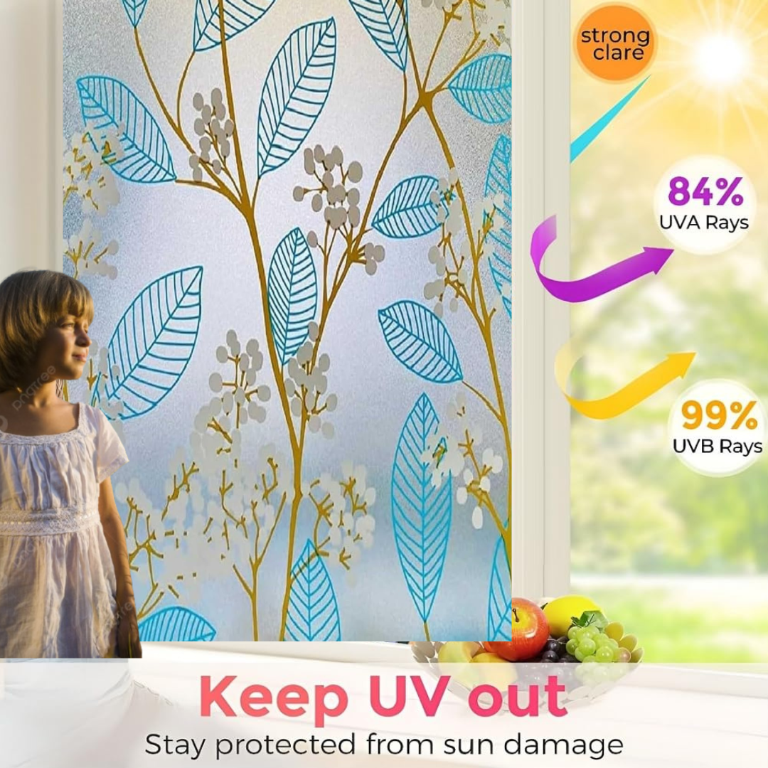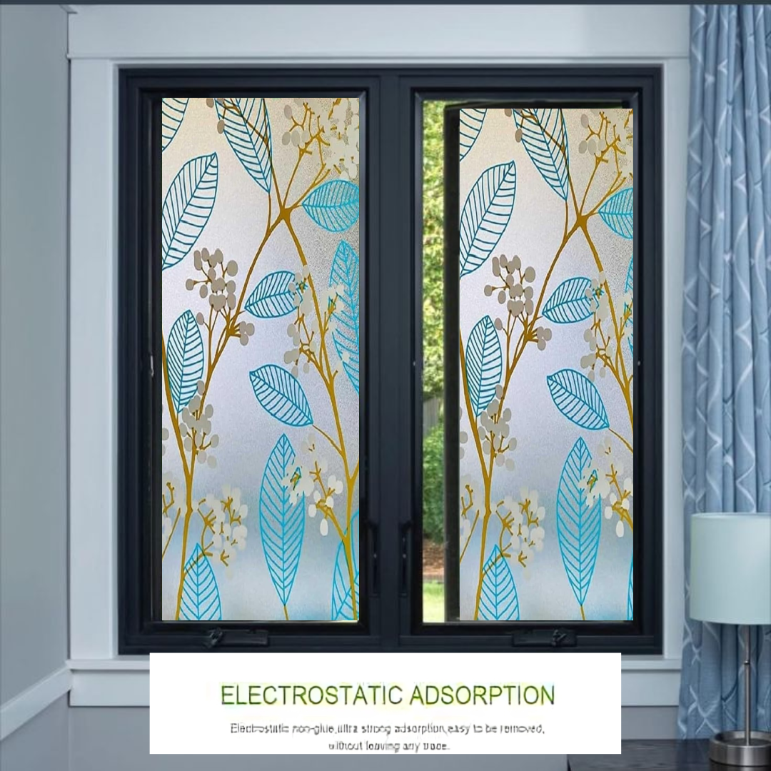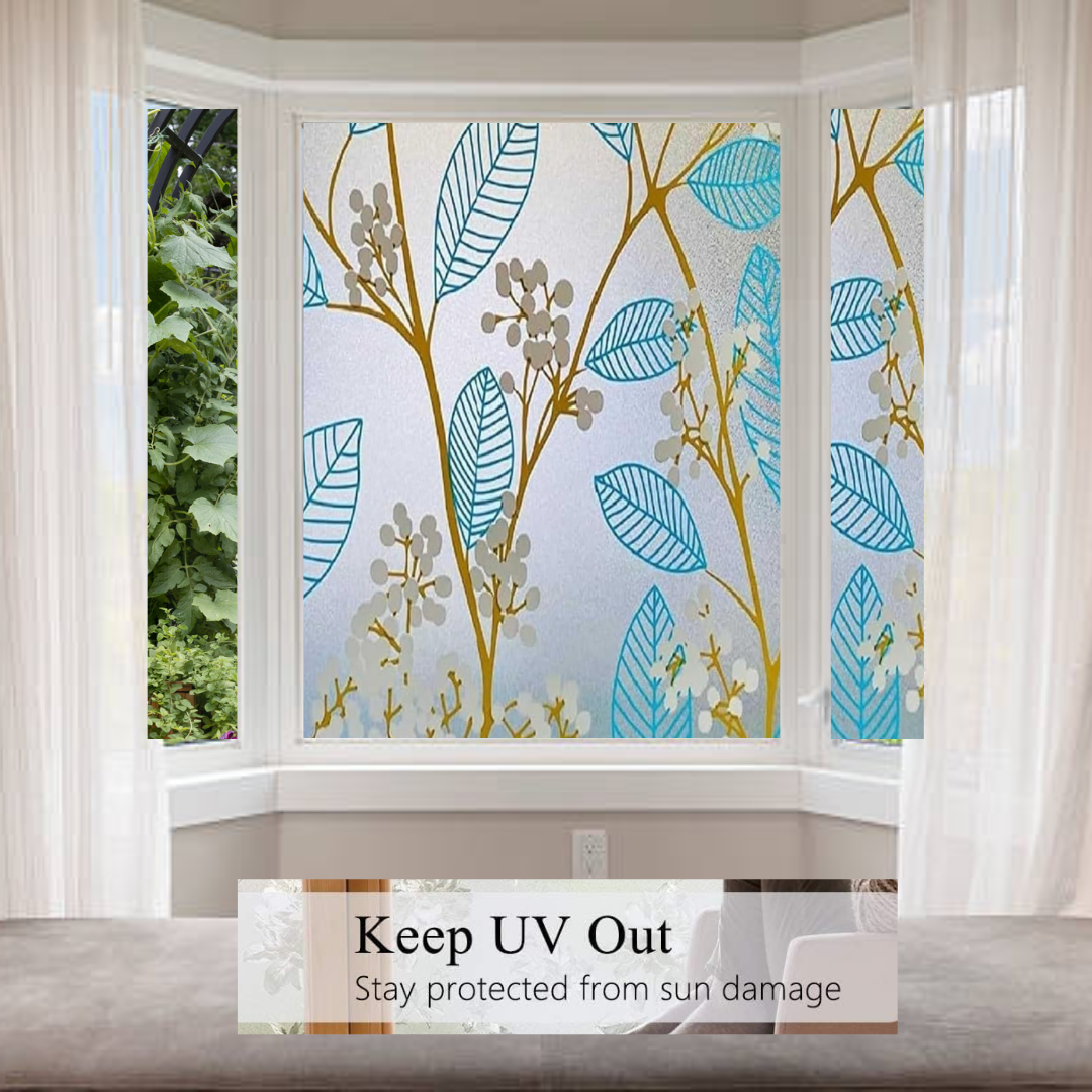 - PRIVACY DESIGN: Wallnest window Frosted glass vinyl film with elegant blue leaves and golden branches pattern provides both decorative appeal and privacy protection with elgant window view